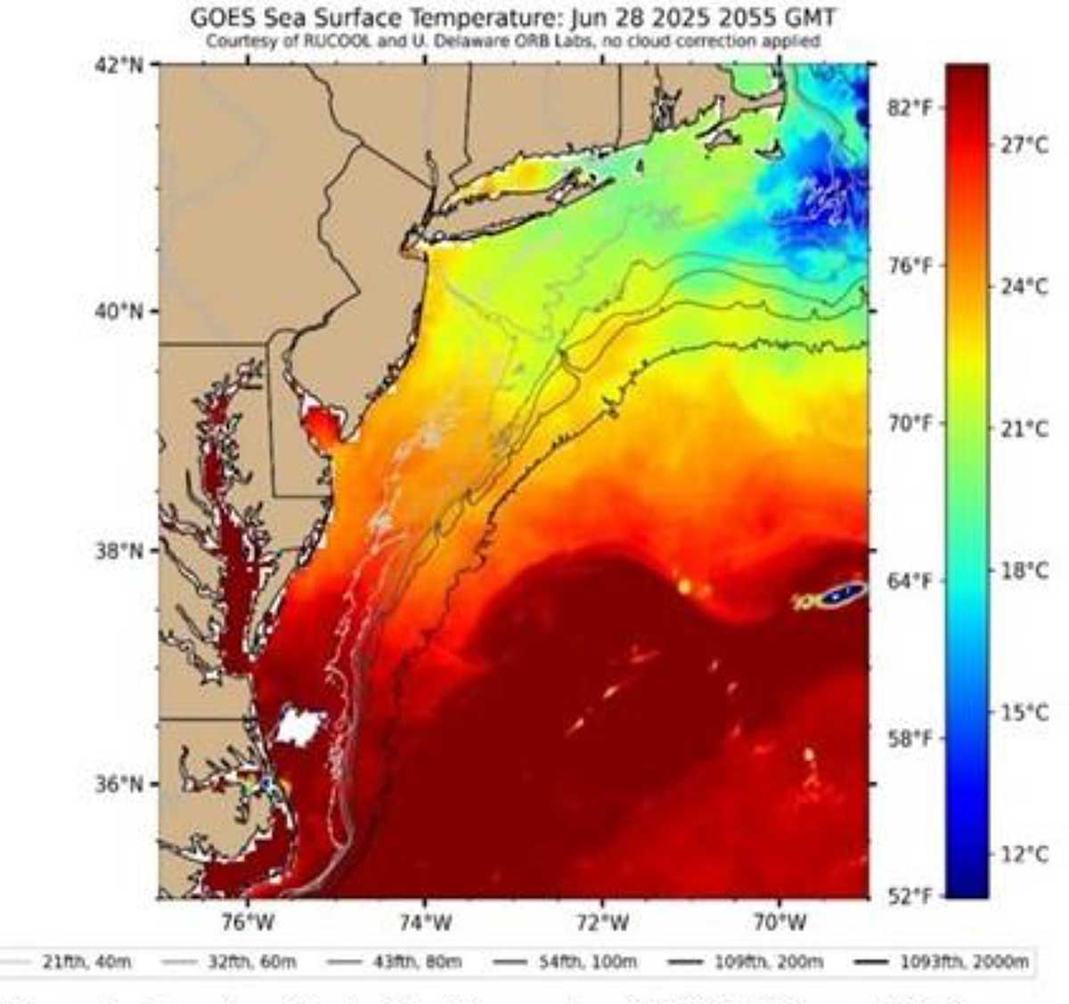 Fortunately, oceanographers from the Rutgers University Center for Ocean Observing Leadership (RUCOOL) study many aspects of our coastal ocean and make this information publicly available for free, including temperature data of surface waters as measured using satellites and autonomous underwater vehicles (AUVs) called gliders.