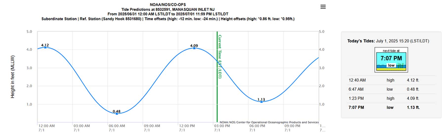 If you have ever been to the beach at the Jersey Shore (or elsewhere in the world), you are probably familiar with the difference between high tide and low tide (learn more about tides from this resource by NOAA). Whether it is high or low tide can impact your experience while swimming or fishing at ocean or bay beaches, and the stage of the tide can also impact your access to many different areas along the coast. It is helpful to check out information about the timing and amplitude of the tides whenever you head out so that you can plan your activities. The following is a valuable resource with tide predictions for many areas along the New Jersey coast as made available through NOAA. An example is shown in Figure 6 for the Manasquan Inlet in Point Pleasant Beach.