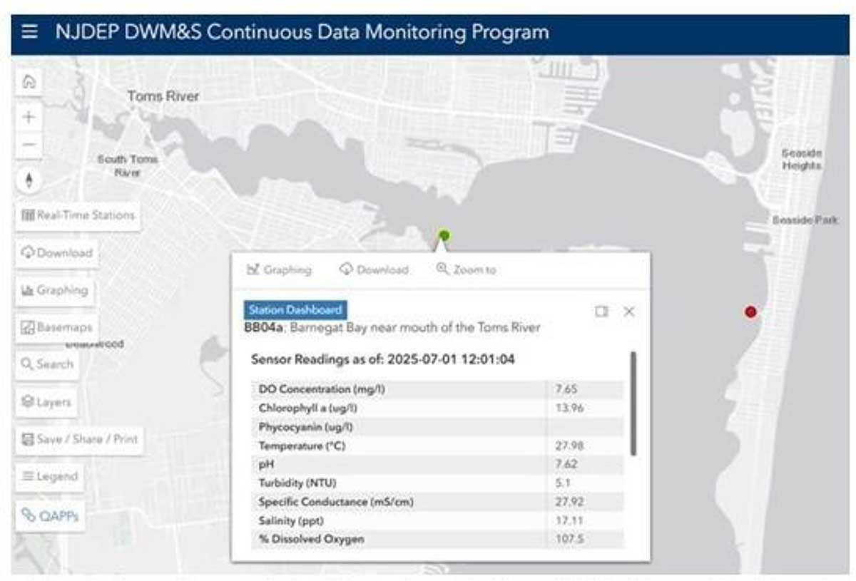 The Bureau of Marine Water Monitoring (BMWM) is a part of the New Jersey Department of Environmental Protection (NJDEP) and they work to evaluate New Jersey’s coastal water quality to ensure the safe consumption of shellfish and to identify potential pollution sources to protect public and ecological health. The BMWM’s Continuous Data Monitoring Program includes a network of water quality sensors that monitor water temperature, as well as many other parameters such as salinity, dissolved oxygen, and pH. Data from this program can be accessed on their program’s website to obtain real-time and historical water quality data. Currently active locations are focused on Barnegat Bay, including the Metedeconk River, Toms River (Figure 3), Oyster Creek Channel, Manahawkin Bay, and further south to Little Egg Harbor Inlet.