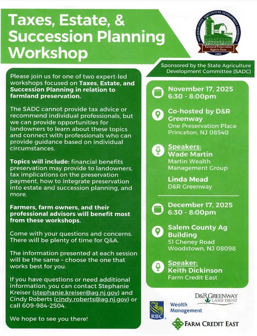 Join the State Agriculture Development Committee (SADC) for an expert-led workshop on taxes, estate, and succession planning in relation to farmland preservation.